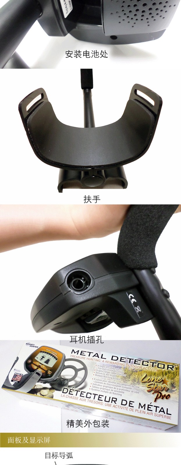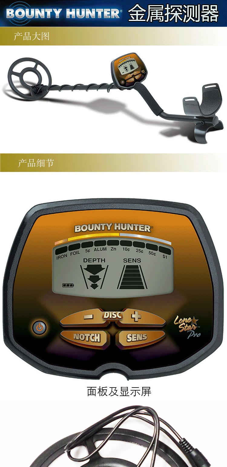 美國bounty hunter公司的LONE STAR PRO地下金屬探測器是性能優(yōu)越外形美觀的金屬探測器。它不僅靈敏度高特別輕巧,而且具有判別力強、準確度高等顯著特點。可使被探金屬物直觀地顯示在液晶屏上,可讀性更強。LONE STAR PRO液晶顯示型地下金屬探測器可根據(jù)需要設(shè)定探測金屬類別、設(shè)定音調(diào)大小、 設(shè)定探測靈敏度。而且具有世界至的地面抓斗功能,可以排除地表礦化對探測產(chǎn)生的影響。該產(chǎn)品操作簡單,使用方便,很受新老用戶的青睞。它能在草坪、雪地、沙灘、荒郊野外以及名勝古跡等場所尋找人們遺忘或丟矢的錢幣、金屬物品等。實際使用過程,會讓您感到樂趣無窮。該儀器具有自動識別功能,其特點是可以排除礦化反應(yīng)、除排外在干擾,是探寶者的必 備產(chǎn)品之一。