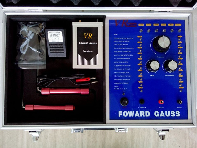 一個鑲有鋁邊并帶有把手和兩把鎖的白色箱子,該箱子里裝有發(fā)射器和其它 附件。該發(fā)射器是安裝在盒子里,發(fā)射器的面板上有六個LED頻率指示燈,且每個指示燈都代表某項功能,字母C開頭的表示銅,字母S開頭的表示銀,字母G開 頭的表示金,字母L開頭的表示鉛,字母T開頭的表示錫,字母D開頭的表示瓷器玉石。在指示燈的下面有個頻率選擇開關,可以自由調節(jié)您所需要探測的金屬種類。頻 率選擇開關的下面,有兩個旋鈕,分別標有"水平"、"垂直"字樣,分別代表探測深度與范圍。左右各有一豎排十個指示燈,可以用水平或者垂直鈕來調節(jié)您所要 選擇的探測深度和探測范圍(探測深度為10-100M,每10M一個指示燈共計十個,探測范圍為200-2000M,每200M一個指示燈共計十個)。主 機面板下方一排從左起為電源總開關,電源充電孔,以及一紅一黑的兩個發(fā)射天線插孔。充電電路已經(jīng)被設計在儀器內部,電池安裝在儀器中部的面板下面。(切 記:充電時請先用大陸公司贈送的220V轉110V的轉換器插入家用電插座然后將充電器接插在轉換器上)