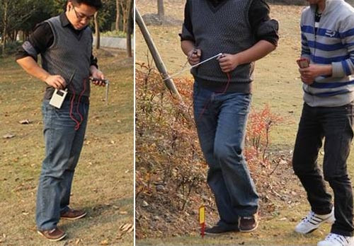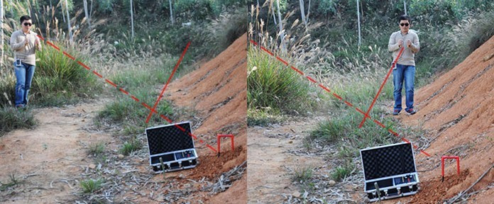 8. 重復第六步。當你接近發(fā)射天線和測試物這條線的時候,接收天線應該是交叉的。(記住:測試物和發(fā)射天線之間的信號線將會形成,而不是測試物和 發(fā)射器之間 的信號線)。當你走過這條線的時候,接收天線將不會交叉。在天線交叉處做下標記。現(xiàn)在,再遠離發(fā)射器一些距離(如果一。開始距離發(fā)射器5到6米,則應到8 米處)。重復上述過程:在接收天線交叉處做下標記。然后通過發(fā)射器和做標記的兩個地方畫一條線,這就是你確定的X軸。關掉發(fā)射器和接受器,然后等15分 鐘,把發(fā)射天線和發(fā)射器挪到一個新的地方,重復這一過程。記住要把發(fā)射天線埋進去。這次你確定了Y軸,X軸和Y軸的交叉處即目標物所在地。