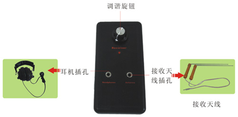 先把發(fā)射天線連接到發(fā)射器對應的插孔內(nèi)。把發(fā)射機上的開關打開到ON位置來測試指示燈。也可以同時在發(fā)射天線的旁邊放一個小型晶體管收音機,把頻率調(diào)到中波段530HZ來測試儀器,打開收音機,如果發(fā)射機正常工作,則收音機將受到干擾,然后旋轉(zhuǎn)發(fā)射器面板上的頻率旋鈕將會使頻率指示燈依次變亮,當不同的指示燈點亮的時候,收音機干擾音調(diào)會有變化。